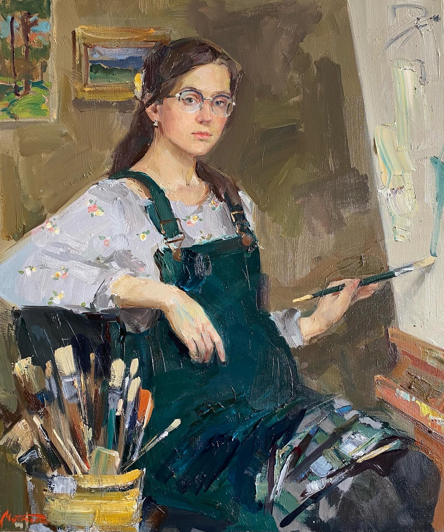 Self portrait with green brush. Oil,canvas. 88x75, 2021.