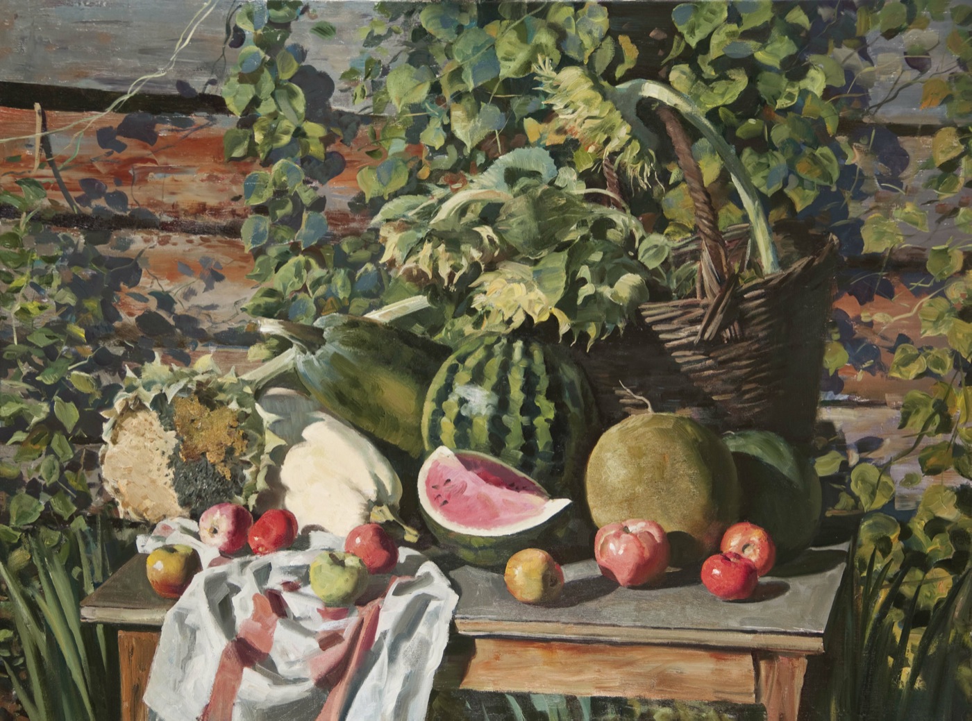 Натюрморт с подсолнухами и арбузом
