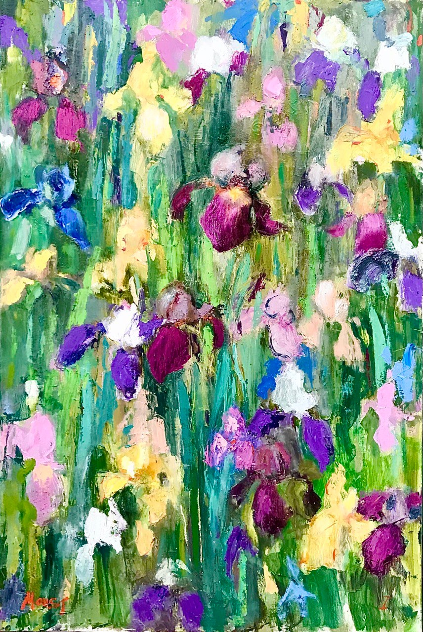 A contemporary expressive impressionistic oil painting of Irises flowers, with green foliages and leaves. This artwork is painted with a palette knife, with heavy textured oil painting. The painting is signed on the front and on the back. This artwork will be delivered with an invoice and a signed certificate of authenticity. Shipping carefully packed and tracked. Please note that, due to screens, colors may vary. Floral abstract modern contemporary flower painting ideal decoration home design interior impressionistic