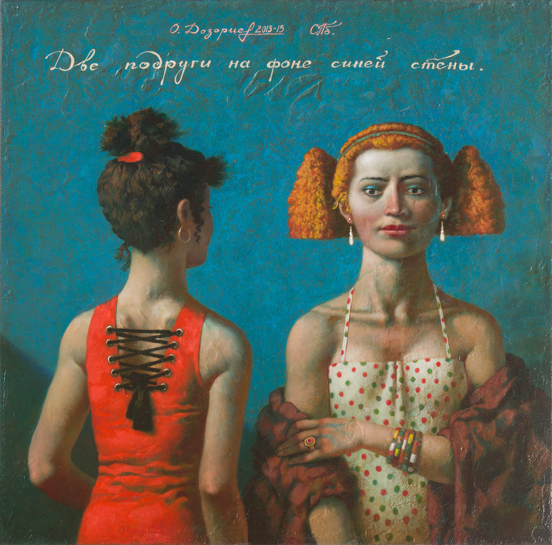 Two girlfriends on blue background